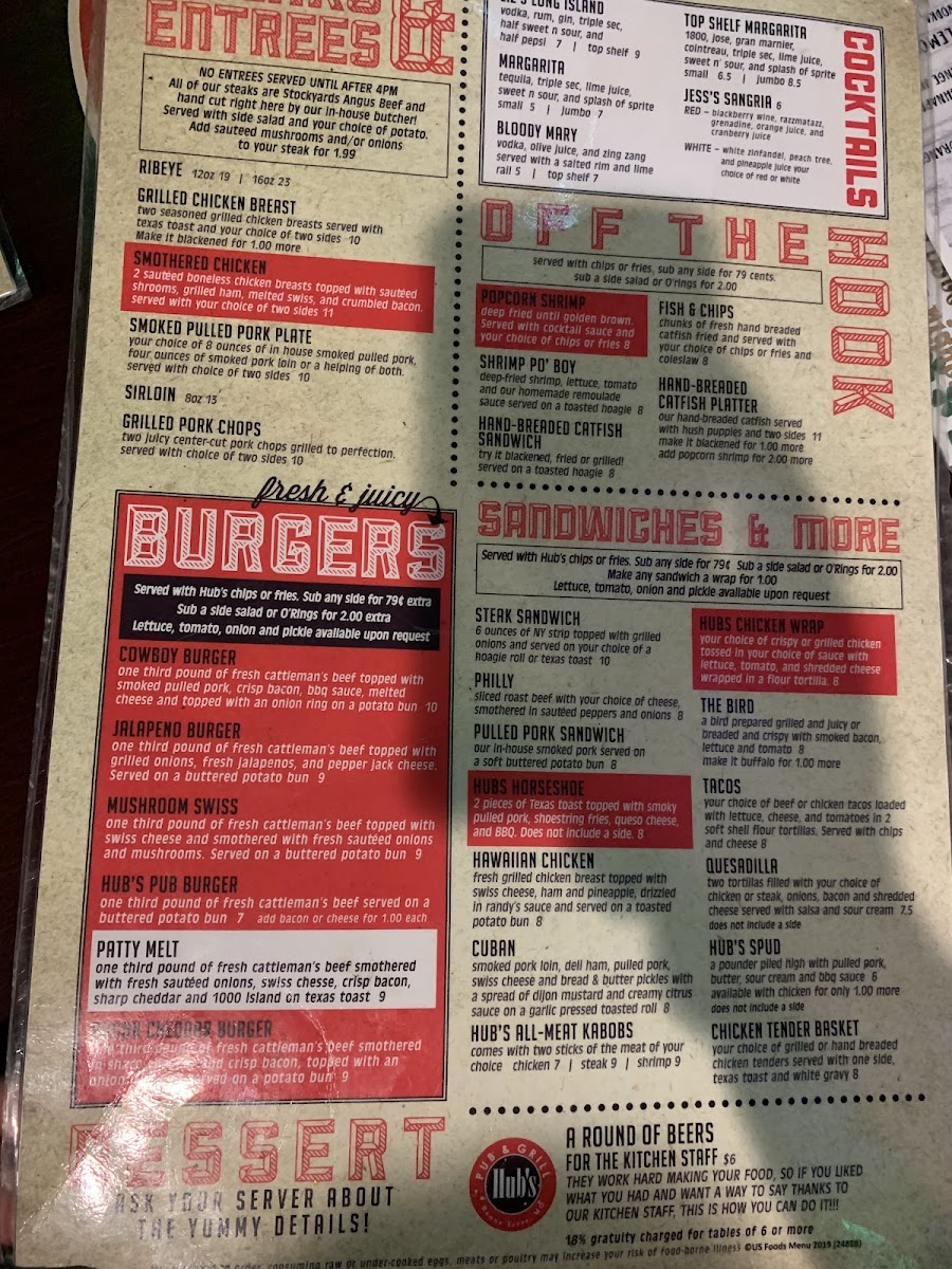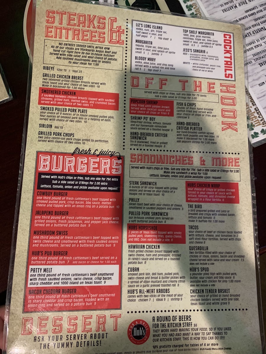 Don’t miss out on Hub's Favorites like the hand-breaded Fish & Chips or the signature Hub's Horseshoe, stacked with smoky pulled pork. With prices starting at $11, you can indulge without breaking the bank. Whether you're at Hubs for an event or a casual dinner, each dish promises satisfaction and flavor that keeps customers coming back.